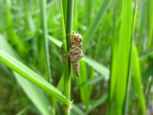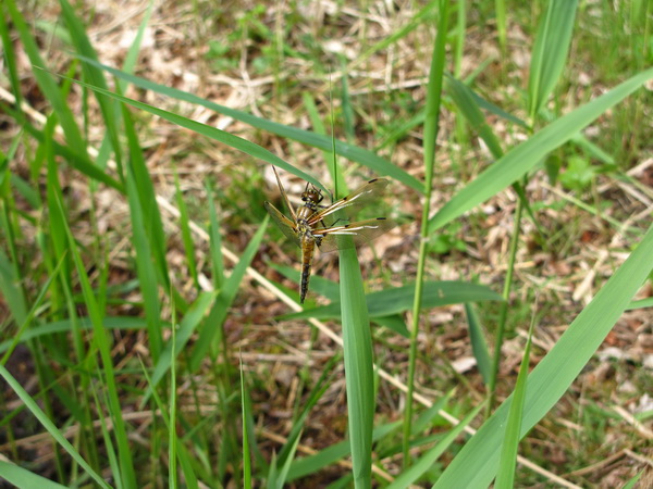 As Spring marches on more wildlife can be seen. This morning while carrying out a Great Crested Newt survey I found a newly emerged Four-spotted Chaser (Dragonfly) which is at the top of the Common Reed and its nymph case in the middle of the Common Reed. The nymph Chasers emerge under the cover of darkness and climb plants such as Common Reed. They then emerge from the case and the adult chaser climbs further up to let its wings dry and its body harden off. Caught this one finally drying itself off. By the time I had collected all my bottle traps, the sun had warmed it up and the Four-spotted Chaser had flown off in search of food etc.